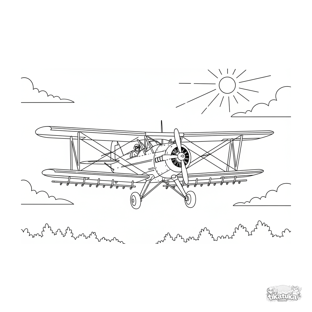 Coloring page for tweens 7-9: a crop-dusting biplane in flight against a picturesque sunset sky. Clear aircraft silhouette with structural details.