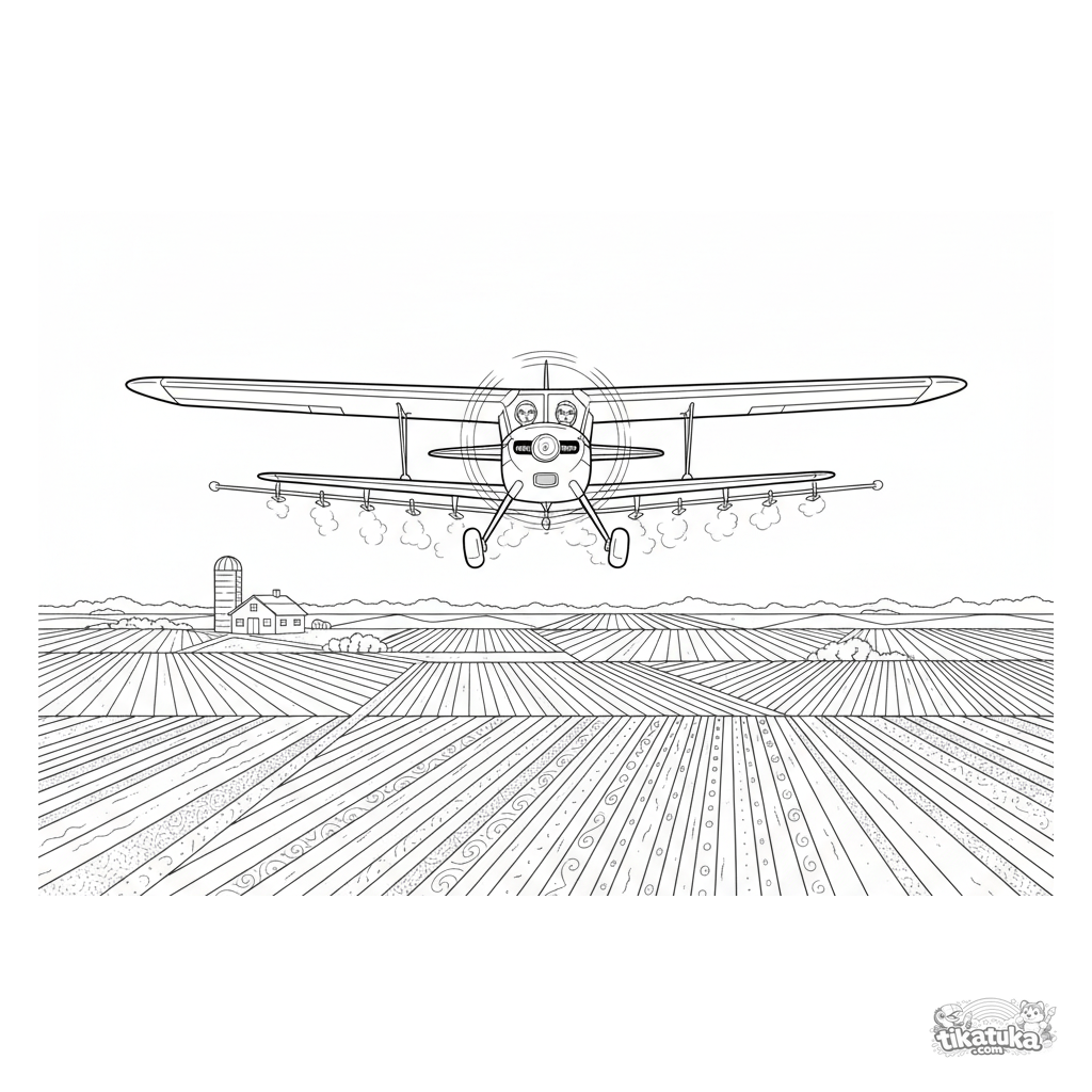 Detailed coloring page of a crop duster plane flying over farm fields. For kids 10-12. Realistic outlines, patterned landscape, wide margins for creative coloring.