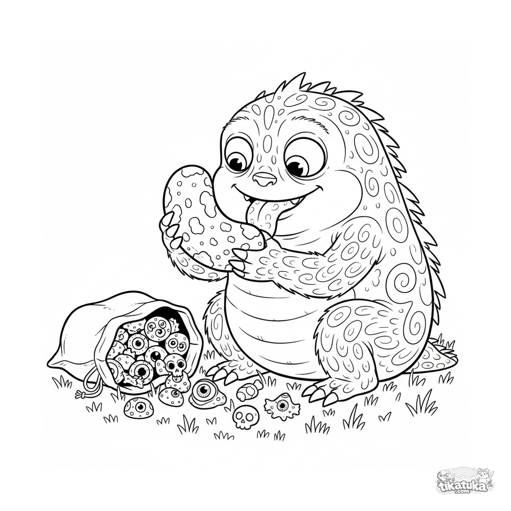 Complex coloring page for kids 10-12: a squat, four-armed monster intently examines a giant jelly bean on the grass. A detailed scene with texture.