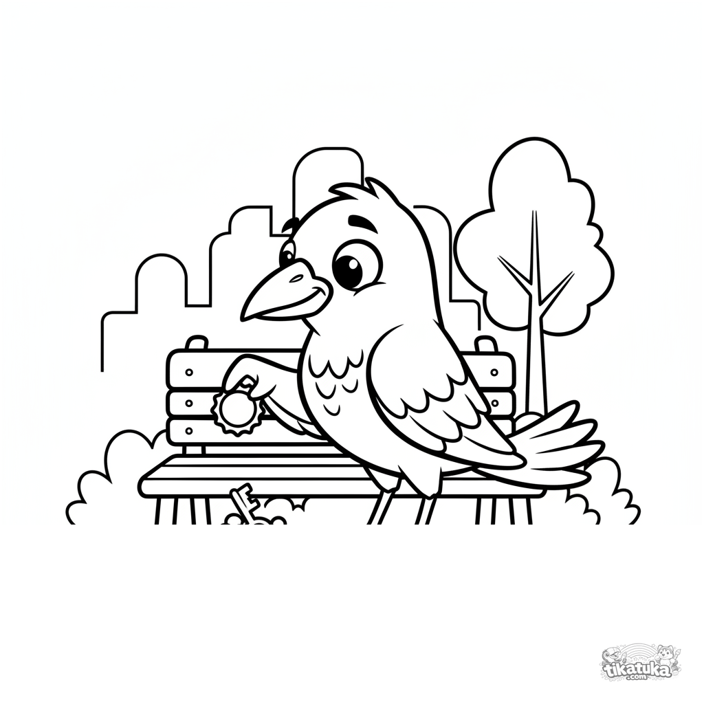 Kids coloring page: a clever crow collecting shiny trinkets in a city park. Paper-cut style with simple shapes.