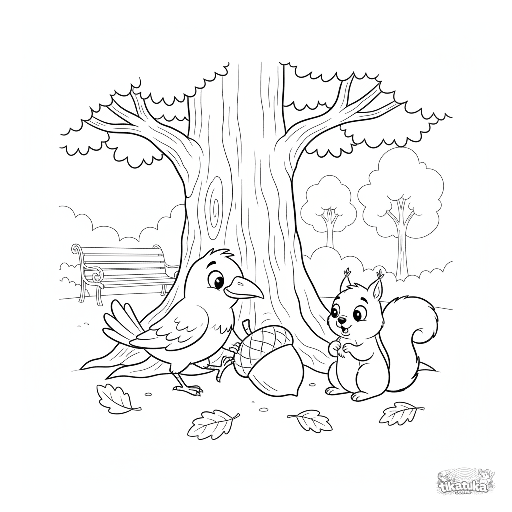 Kids coloring page: a crow in a city park helps a squirrel roll an acorn. A kind animal friendship scene with a detailed oak tree and autumn leaves.