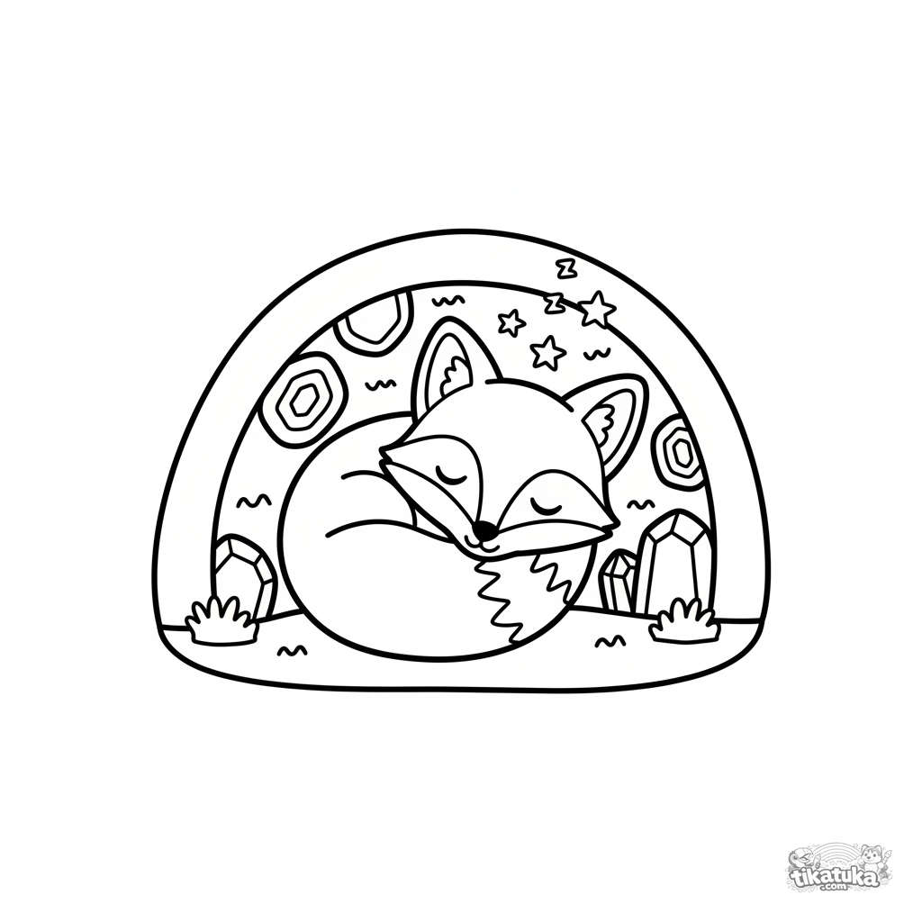 Toddler coloring page ages 2-3: a crystal fox pup sleeps in a cozy den. Simple fantasy scene with large shapes for first coloring.