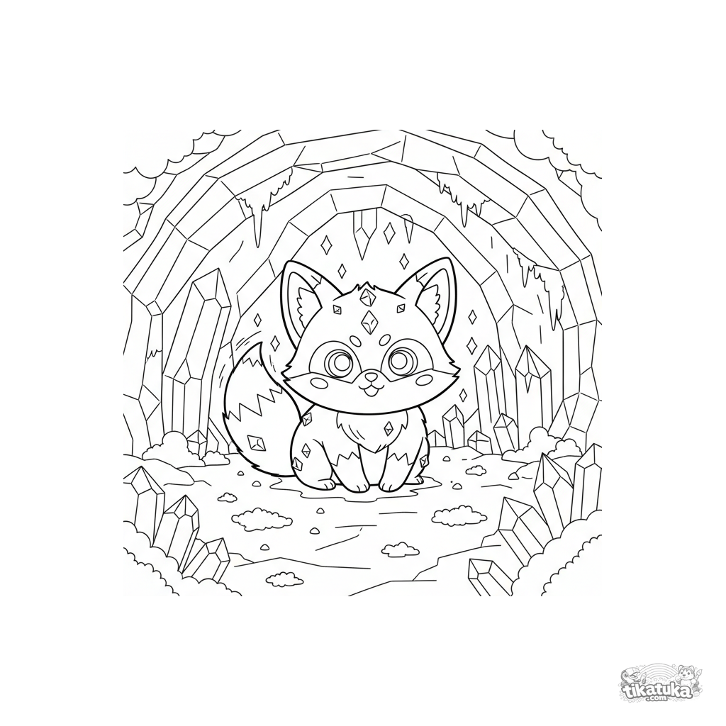 Coloring page for kids 4-6: a mischievous crystal fox pup happily chases its tail inside a sparkling geode cave lined with giant amethyst crystals. A cute and magical fantasy scene.