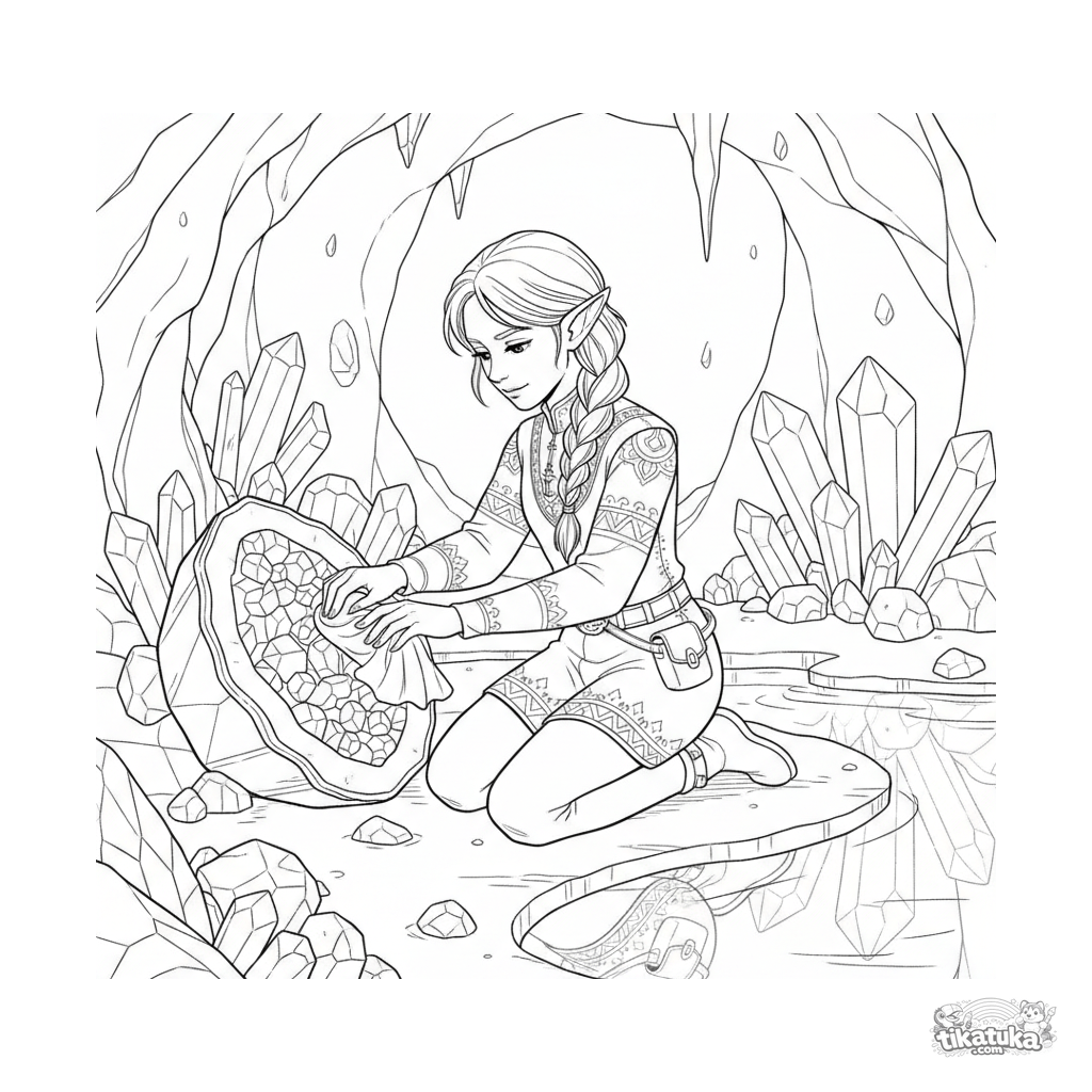Detailed coloring page of an elf crystal keeper polishing a geode in a sparkling underground grotto. For older kids 10-12, art nouveau style.