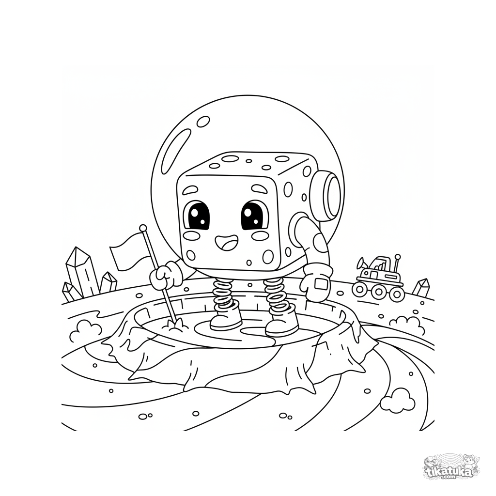 Coloring page for tweens 7-9: a cube-shaped microbe in a space suit explores a crater on a lollipop surface. Clean geometric shapes, moderate detail.