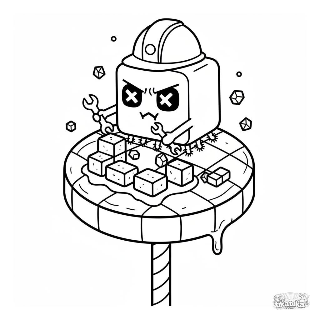 Coloring page for tweens 7-9: a cube-shaped microbe in a hard hat builds a house from sugar bricks on a checkerboard lollipop. Geometric scene.
