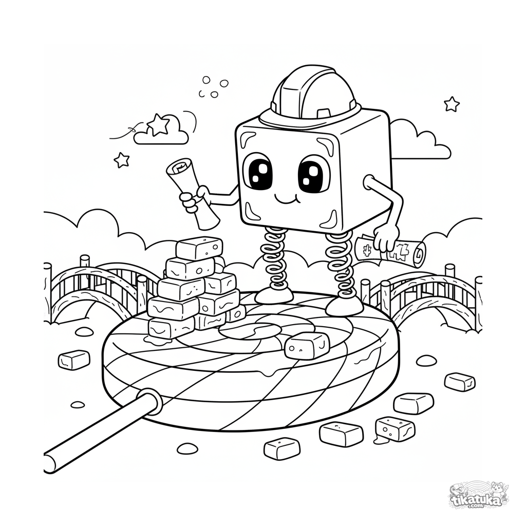 Coloring page for kids 4-6: a cube microbe architect builds a candy bridge on a lollipop. Clear geometric shapes, understandable scene for coloring.