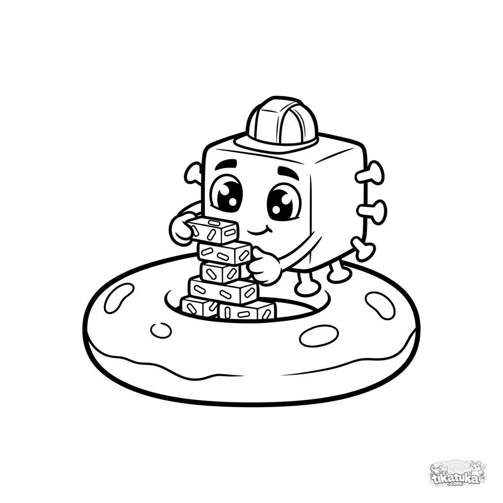 Simple coloring page for toddlers 2-3: a cube-shaped microbe in a helmet builds a sprinkle tower on a lollipop. Large shapes, minimal details for first coloring.