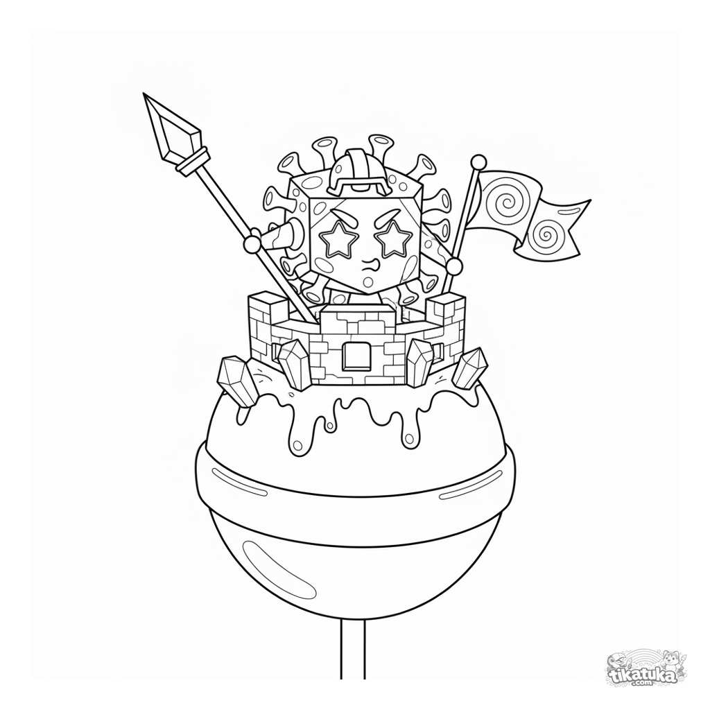 Complex coloring page for kids 10-12: a cubic virus knight guards a sugar castle on a lollipop. A detailed image in a geometric style.