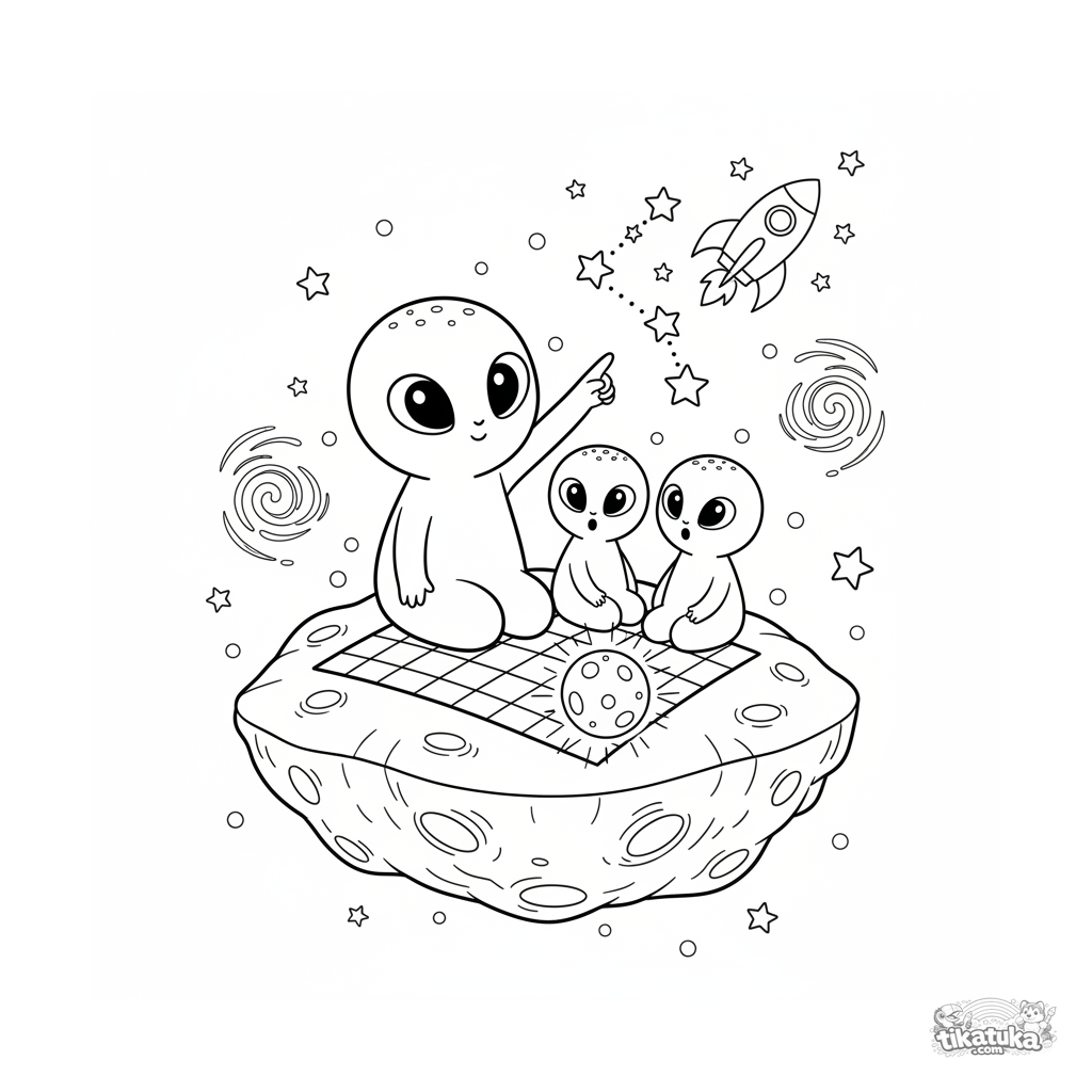 Coloring page for ages 4-6: a cute alien family sits on an asteroid in outer space, looking at the stars. Simple and friendly shapes.