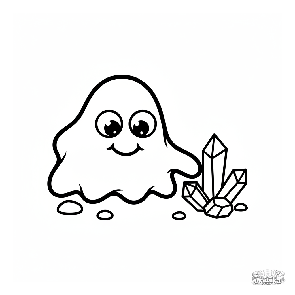 Coloring page for toddlers 2-3: a friendly amoeba with big eyes explores crystals. Very simple shapes, large details, wide margins for first crayons.
