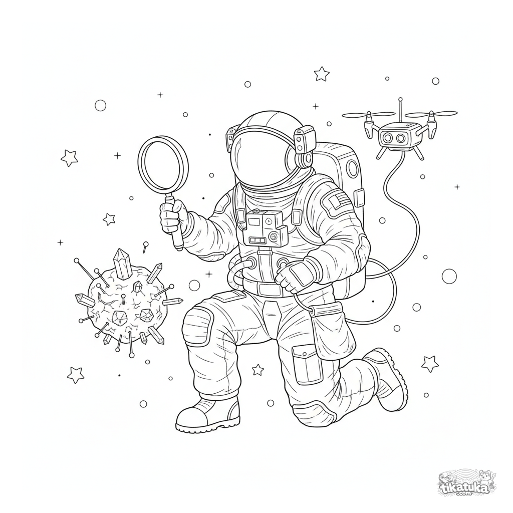 Detailed realistic-style coloring page of an astro-geologist examining a floating crystalline asteroid in outer space. For kids aged 8 and up.