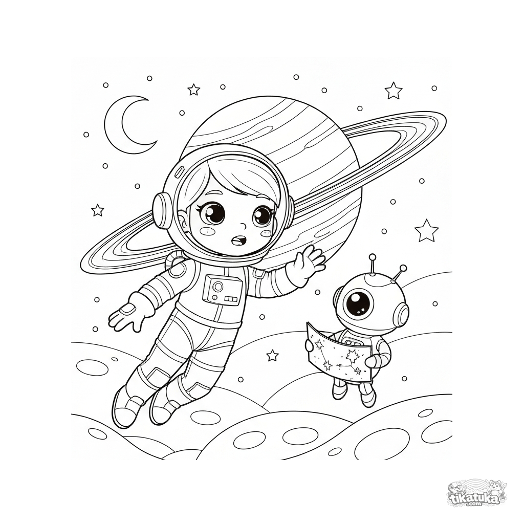 Coloring page of an astronaut girl and her robot companion exploring a ringed planet in space. For kids aged 6-9. Detailed scene with planets and stars to color.