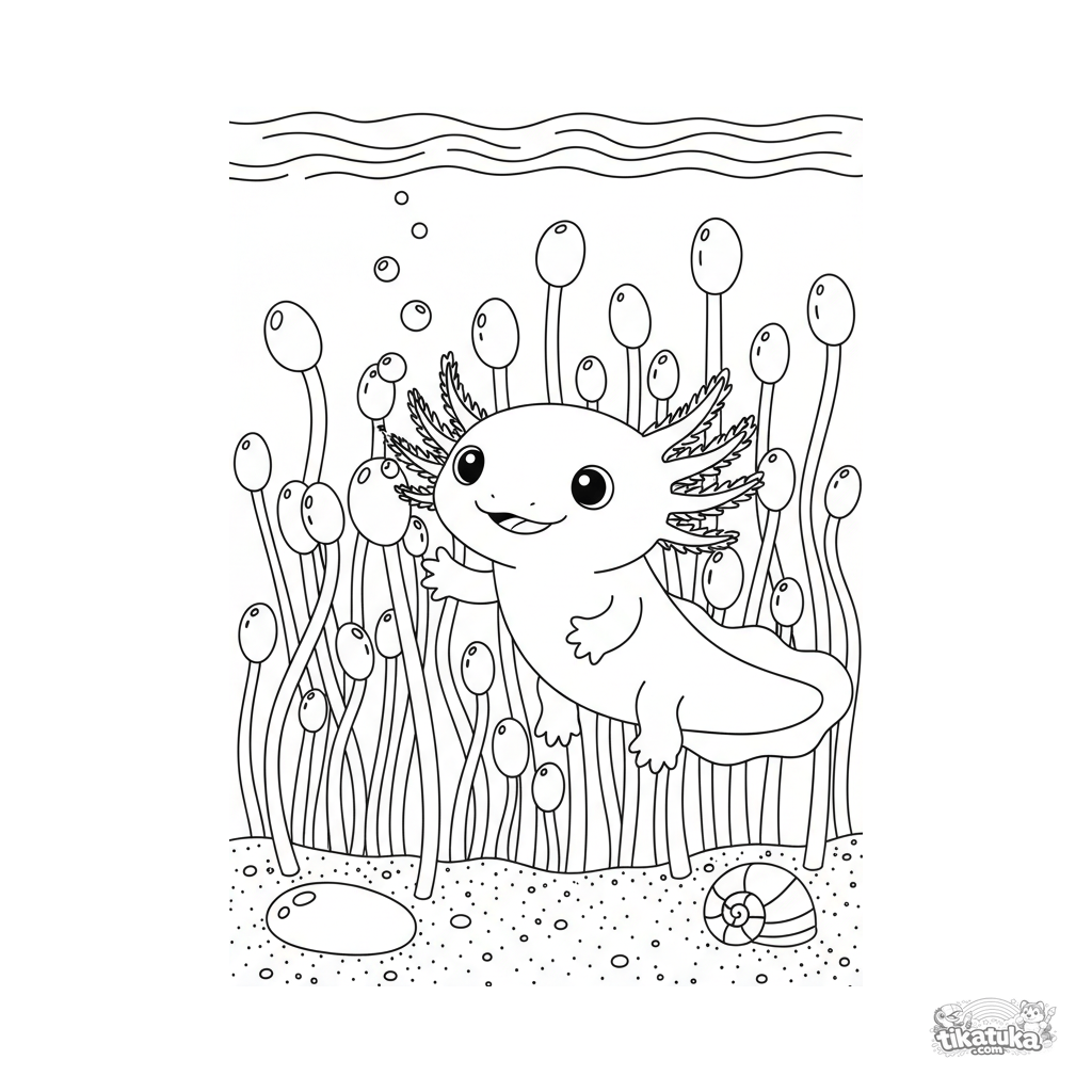 Coloring page for kids 4-6: a cute axolotl explores glowing underwater plants. A magical underwater scene with bubbles and delightful details to color.