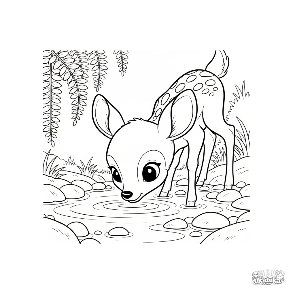 Coloring page for kids 4-6: a curious spotted fawn drinks water from a clear forest stream, surrounded by ferns and smooth stones.
