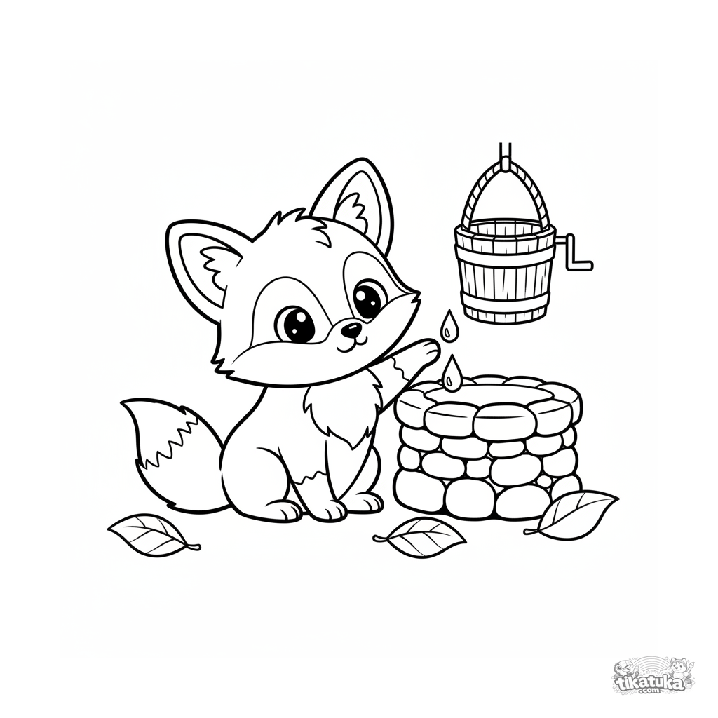 Simple coloring page for the youngest 2-3: a cute fox cub investigates the well. Huge open areas for coloring, friendly character.