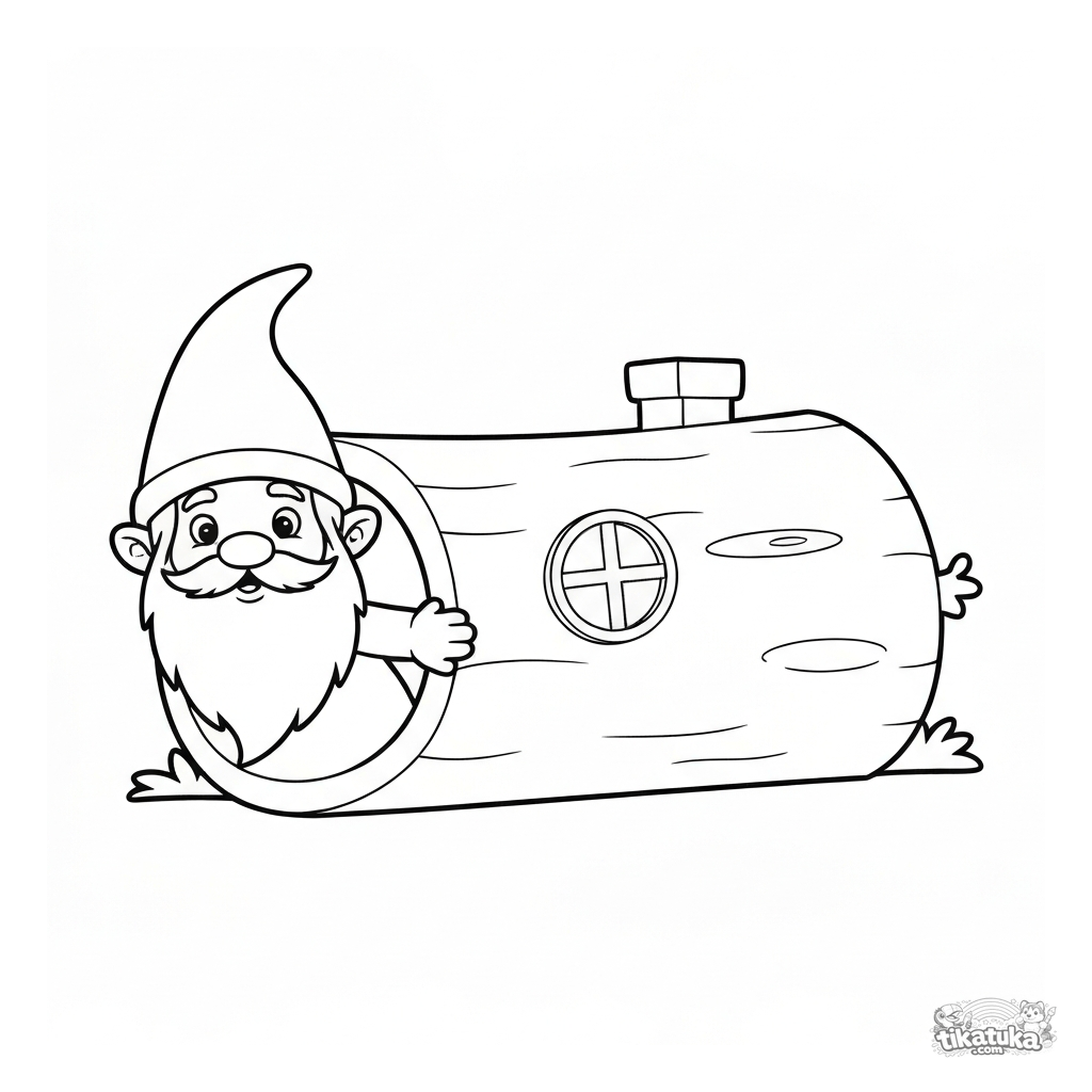 Coloring page for toddlers: a curious gnome peeking out from the round door of his hollow log home. Simple, cute scene for ages 2-4.