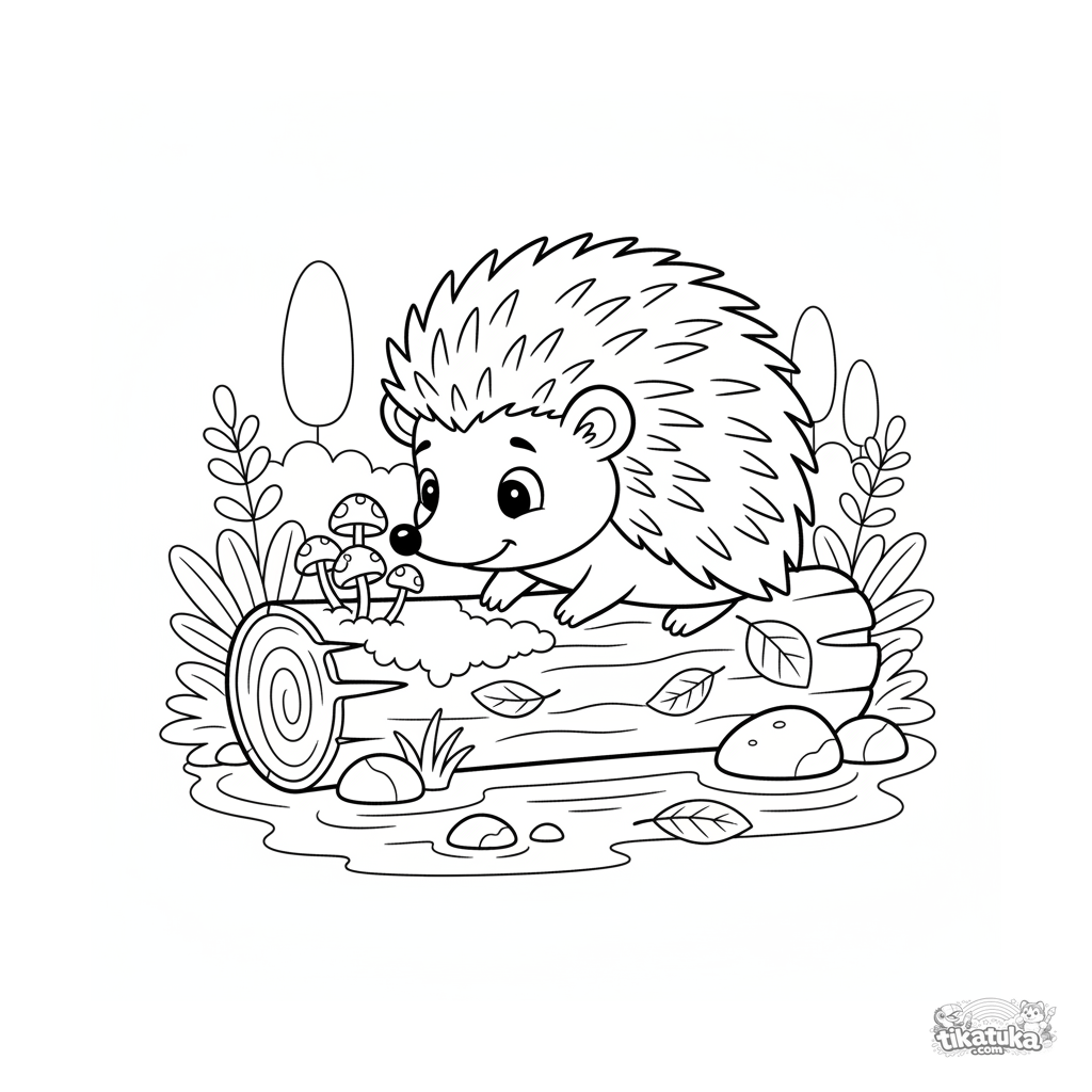 Coloring page for kids 4-6: a curious hedgehog investigates mushrooms on the bank of a clear stream. Gentle storybook illustration style, suitable for preschoolers.