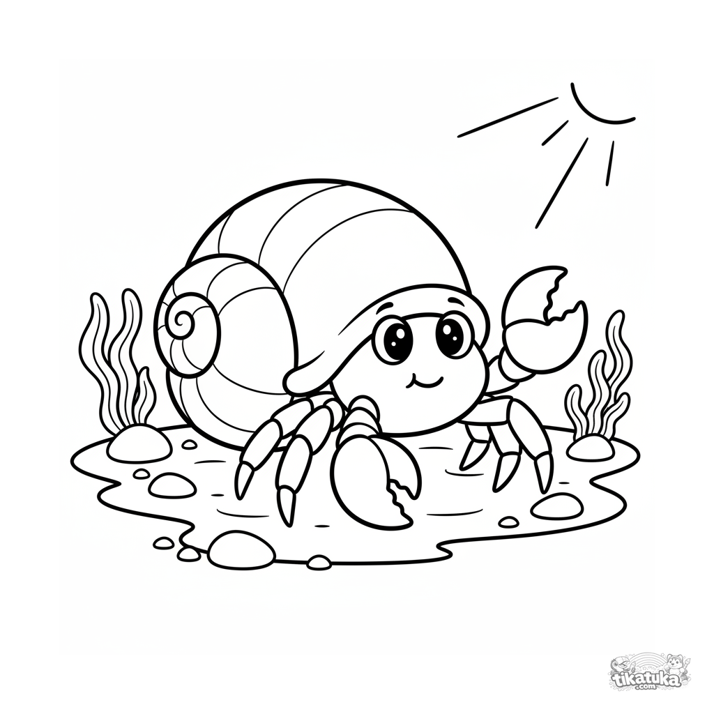 Coloring page for ages 4-6: a hermit crab explores a sunny tidal pool in the shallows. Cute storybook-style illustration with simple shapes.
