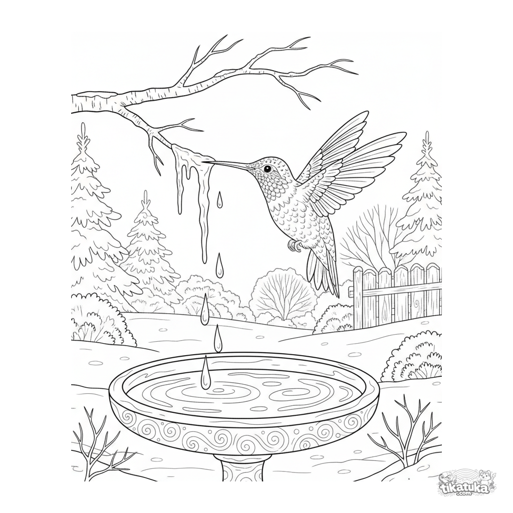 Detailed coloring page of a hummingbird investigating a gleaming icicle in a winter garden. For older kids 7-12. A realistic depiction of the bird and a frosty landscape.