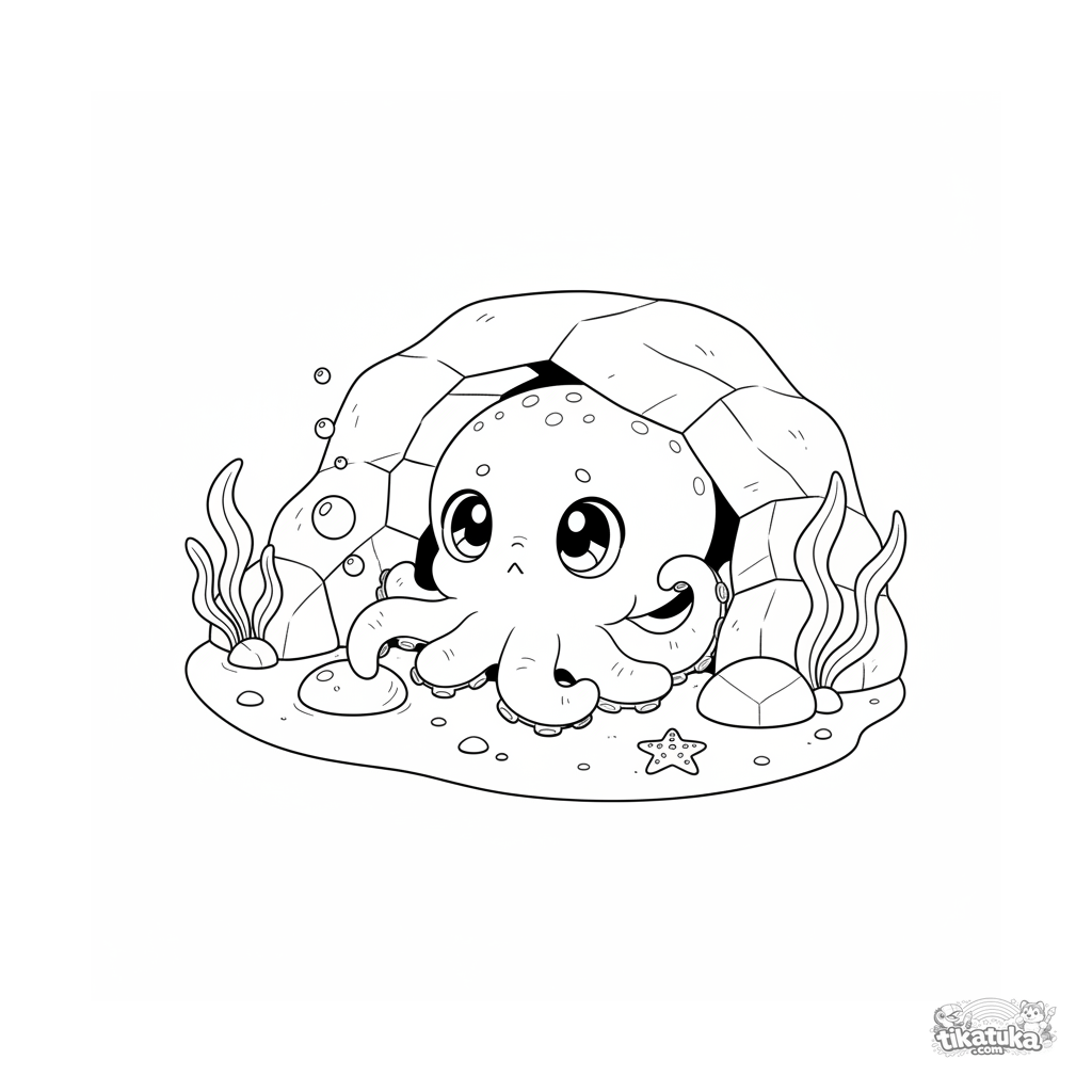 Coloring page for kids 7-9: a curious octopus peeks from a sunlit rock crevice. An expressive scene with moderate detail.