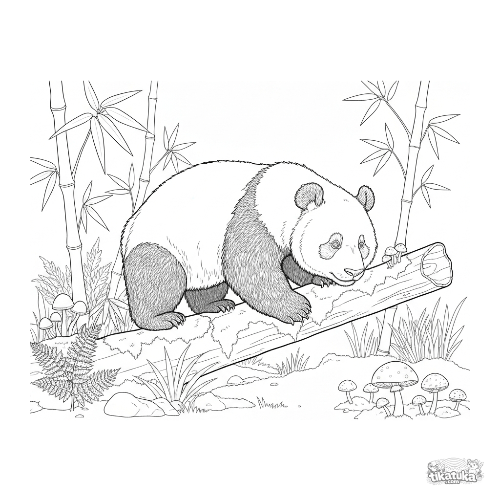Coloring page of a curious red panda for kids 6-9. The panda balances on a mossy log in a bamboo forest, sniffing mushrooms.