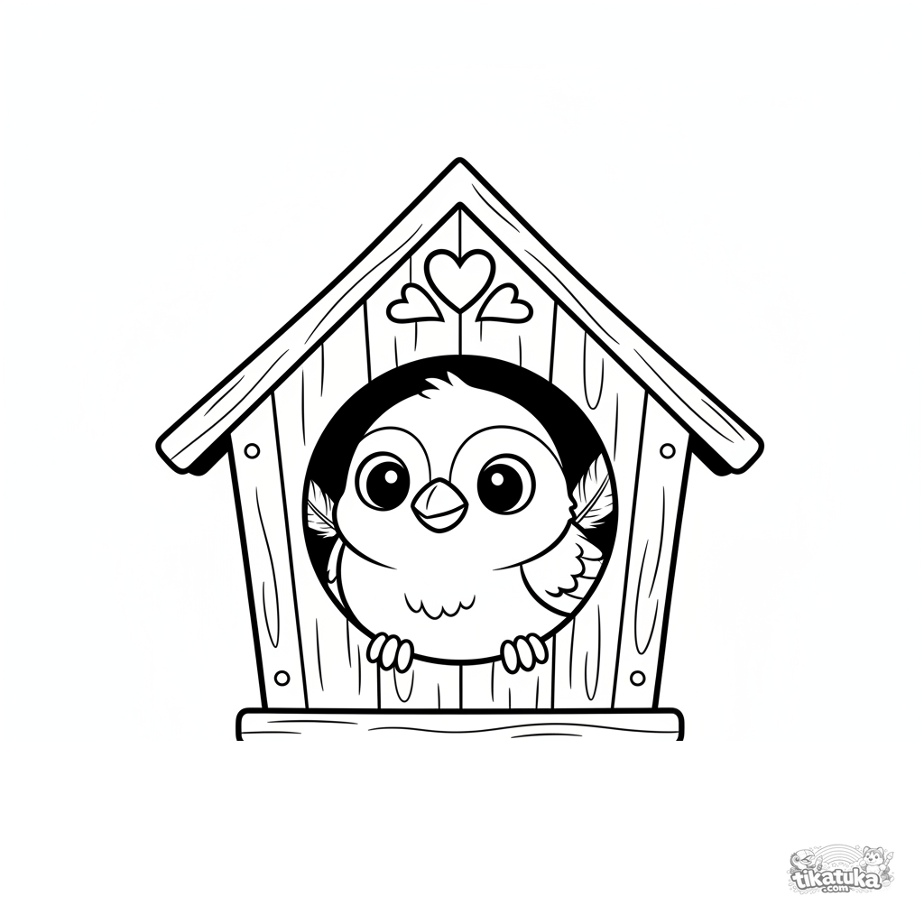 Toddler coloring page: a curious sparrow peeks out from the round window of a wooden birdhouse. Simple lines, large shapes, wide margins.