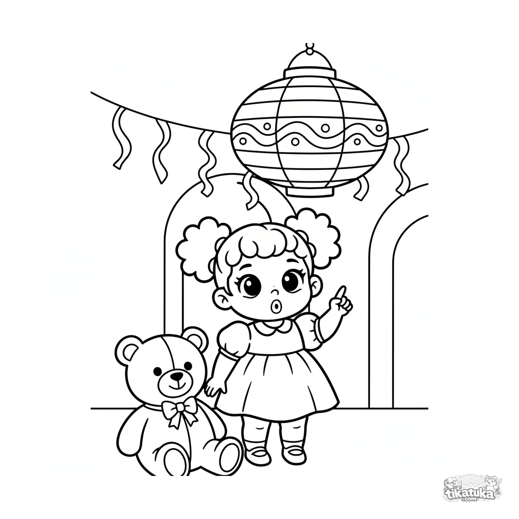 Simple coloring page for toddlers 2-3: a little girl in a festive hall points curiously at a hanging paper lantern. Large, clear shapes.