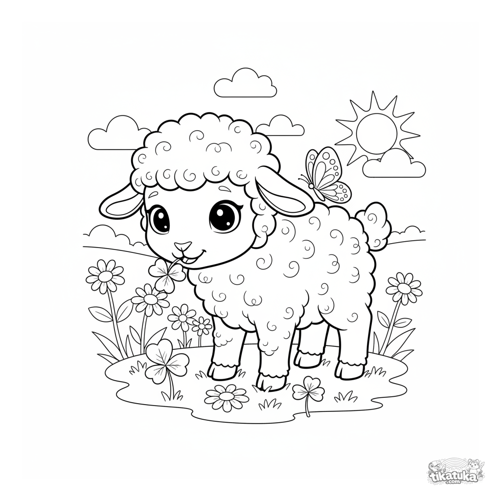 Coloring page of a curly lamb in a spring meadow. For kids 4-6. The lamb nibbles clover with a butterfly on its back. Simple shapes and a sweet scene.