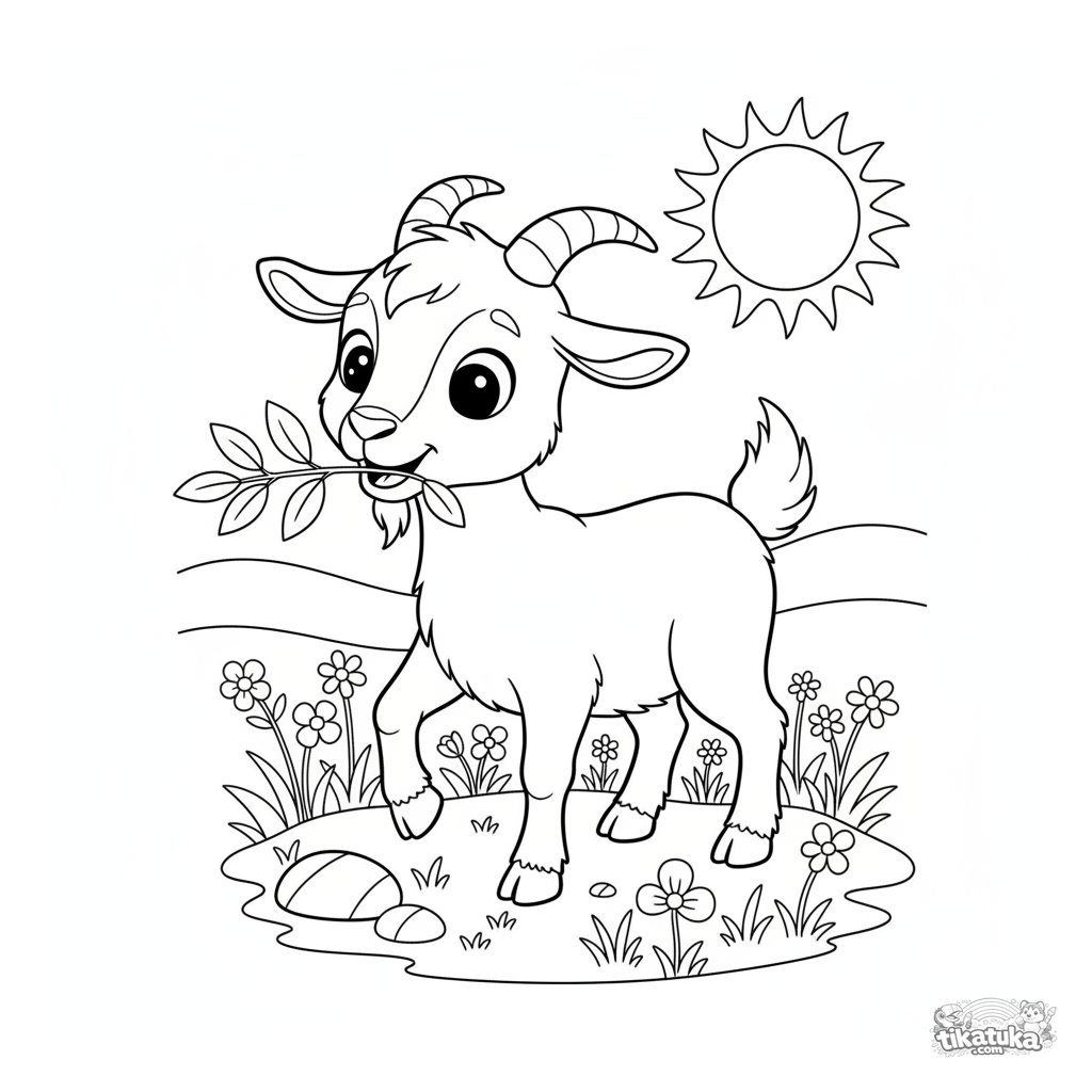 Coloring page for kids 4-6 years old. A playful curly-horned goat kid nibbling a branch in a sunny meadow. Simple shapes and a cute scene.