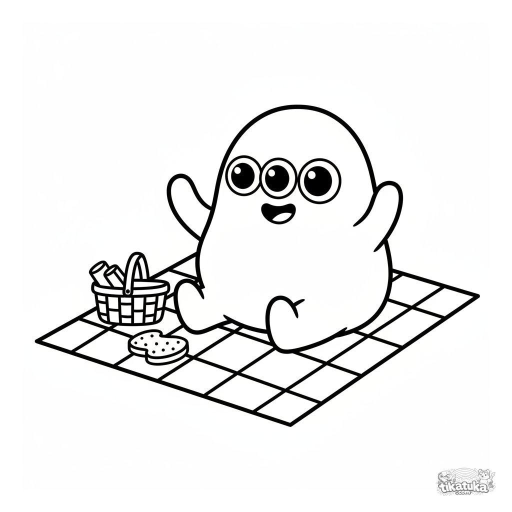 Fun coloring page of a friendly amoeba microbe having a picnic on a checkered blanket. For toddlers aged 2-5, very simple shapes.