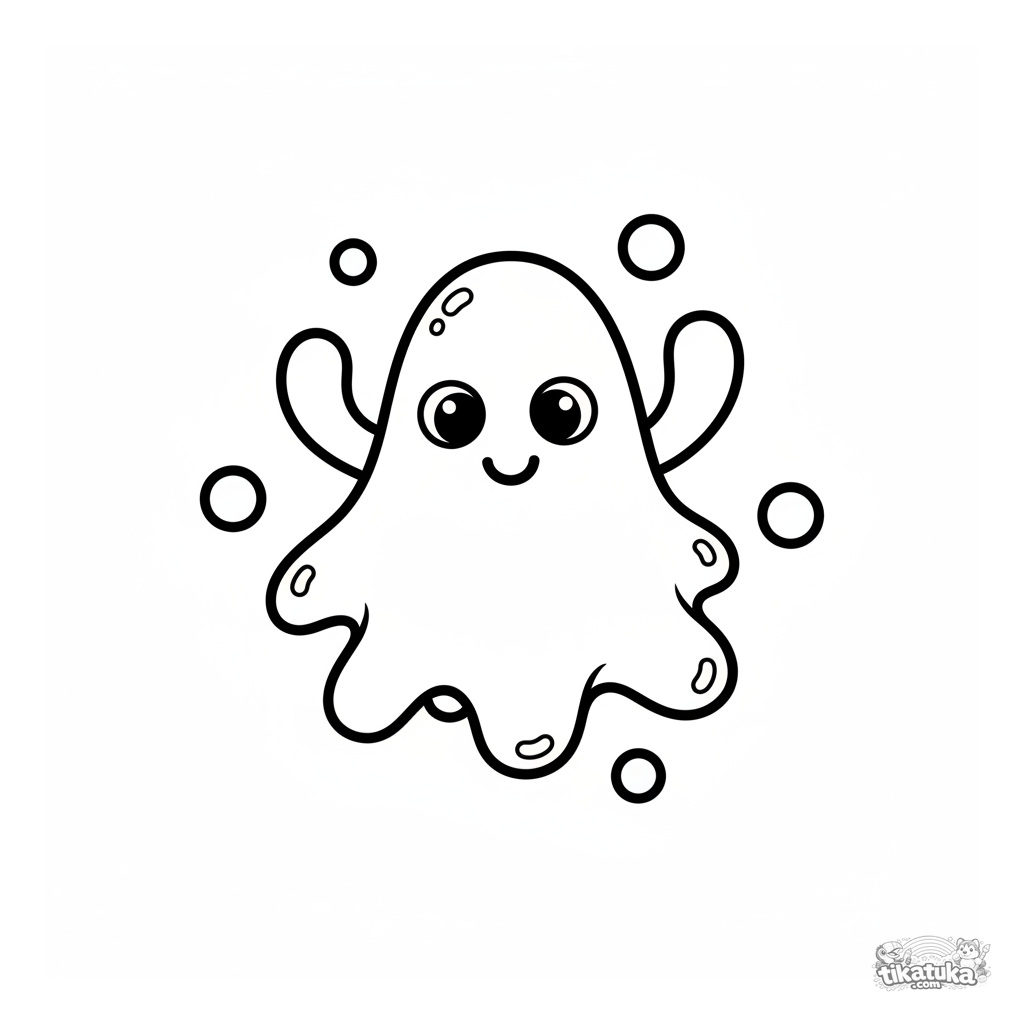 Toddler coloring page 2-3 years: a friendly amoeba with one big eye and a smile waves its pseudopods. Very simple shape, thick outlines.