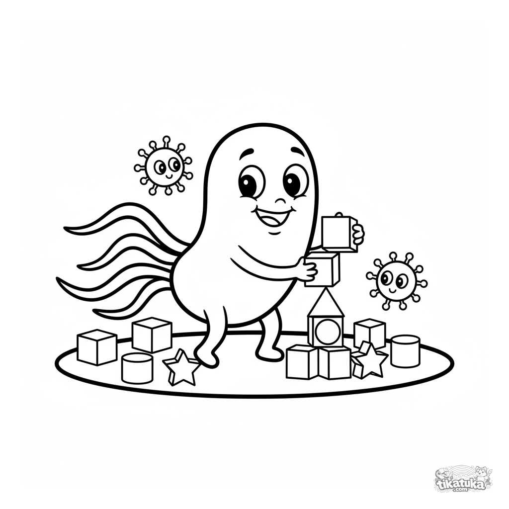Easy coloring page of a friendly bacterium building a tower with blocks. For toddlers aged 2-5. Cute cartoon microbes with simple shapes.