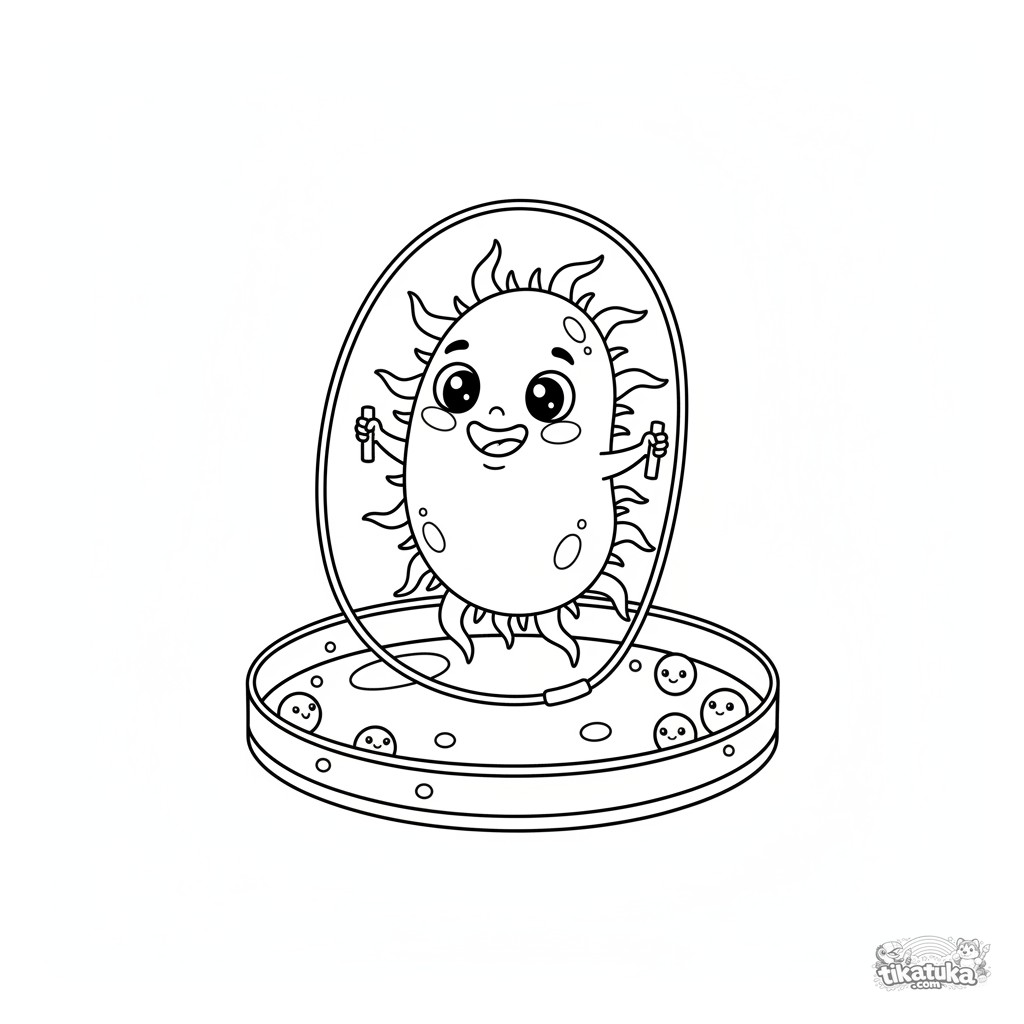 Microbe coloring page for kids 4-6: a friendly bacterium plays jump rope inside a petri dish. A funny, educational cartoon scene for coloring.