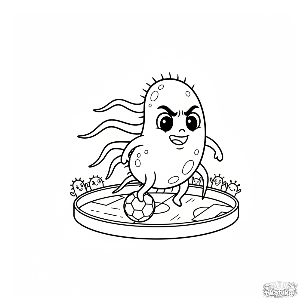 A fun coloring page for kids 4-6: a friendly bacterium with flagella plays soccer on a Petri dish field. A cute and educational scene from the world of microbes.