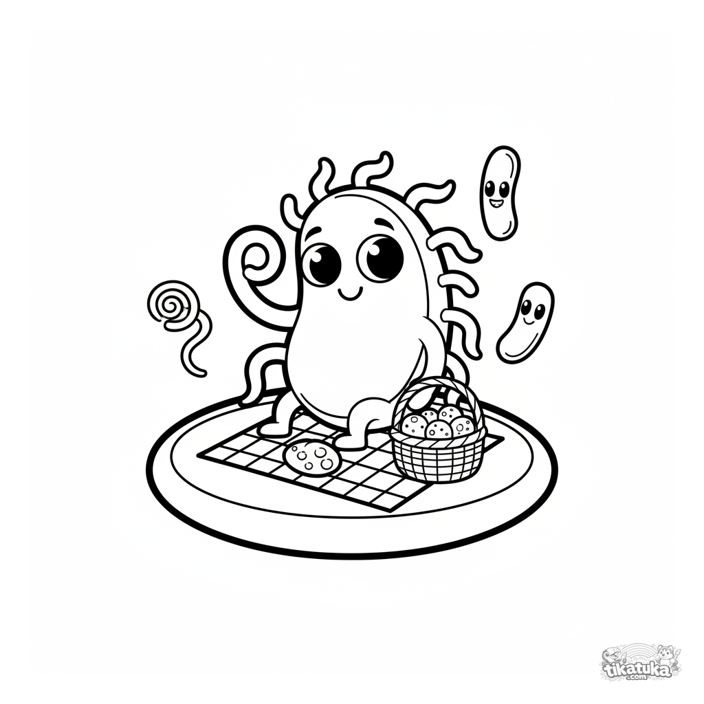 Coloring page of a cute cartoon bacterium having a picnic on a cell. For toddlers aged 2-5. A fun and simple introduction to the world of microbes.