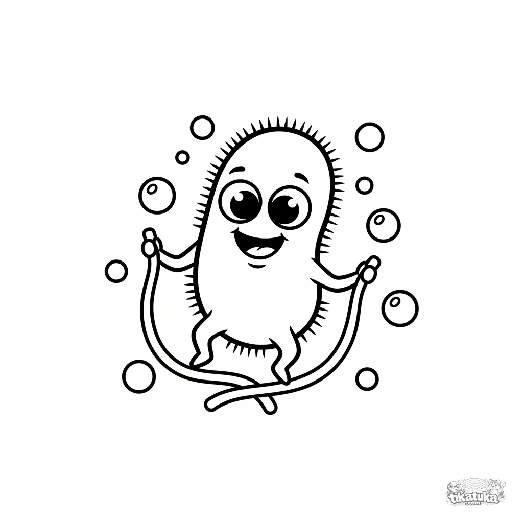 Toddler coloring page: a cute, friendly bacterium with big googly eyes is playing jump rope. Very simple shapes and outlines for kids aged 2-3.