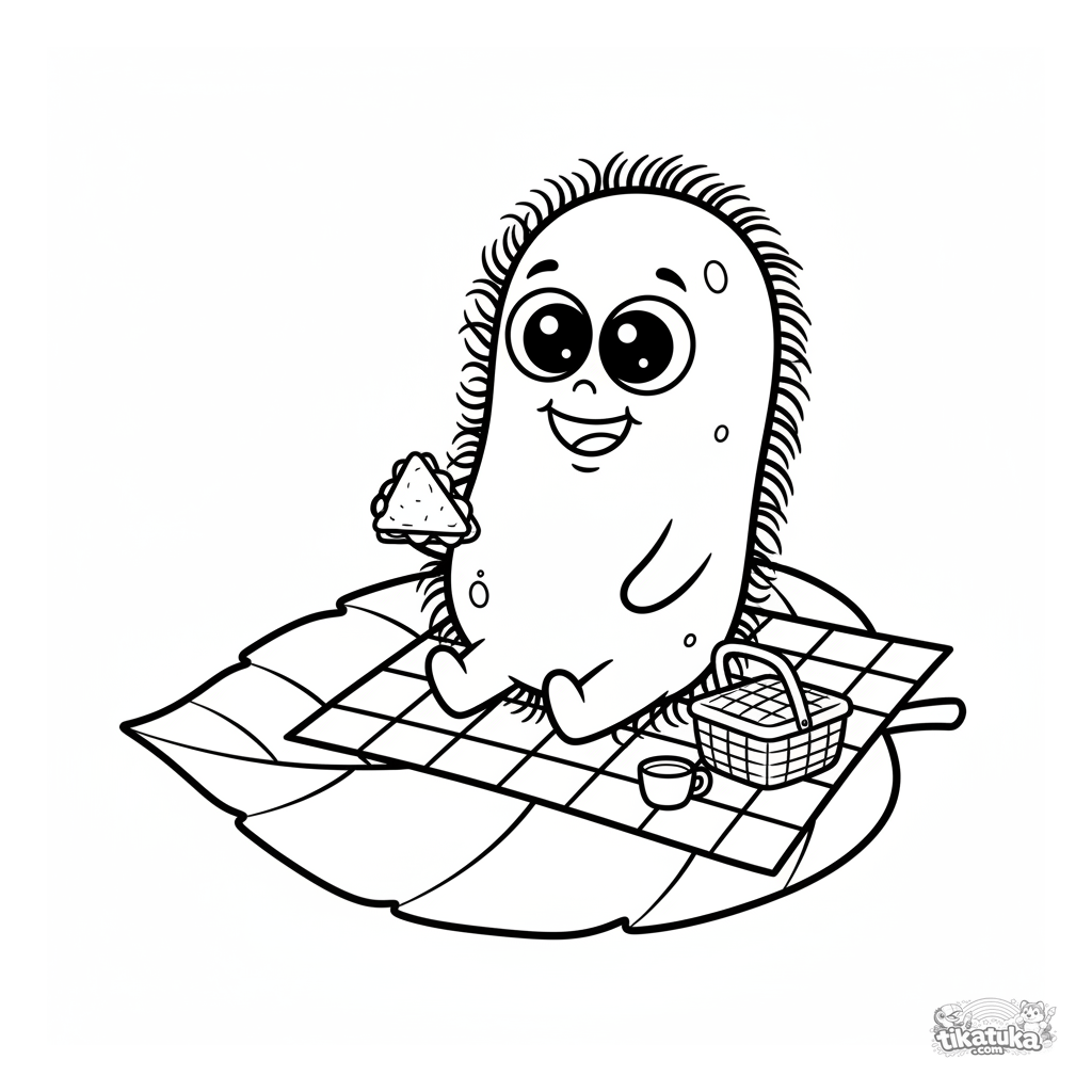 Coloring page of a cute cartoon bacterium having a picnic on a leaf. A simple, funny scene for toddlers aged 2-5 for their first coloring experience.