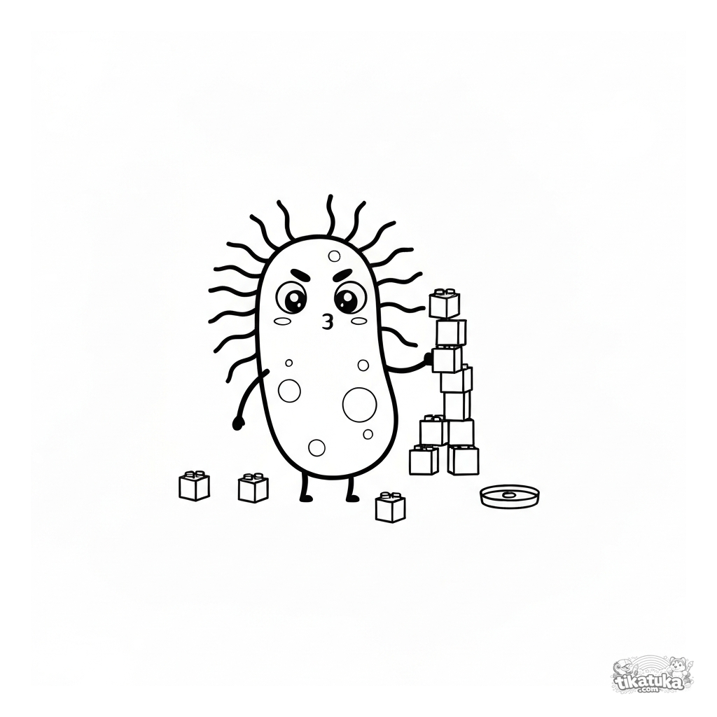 Simple coloring page of a cute cartoon bacterium building a tower of blocks. For toddlers aged 2-5. Large, simple shapes for easy coloring.
