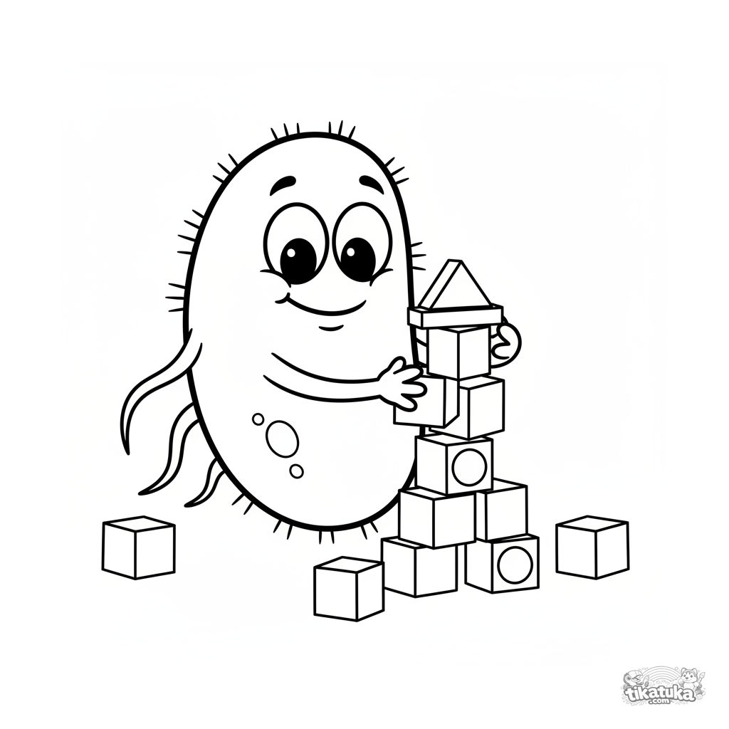 Microbe coloring page: a cute bacterium with googly eyes builds a tower of colorful protein blocks. For toddlers 2-5 years old.