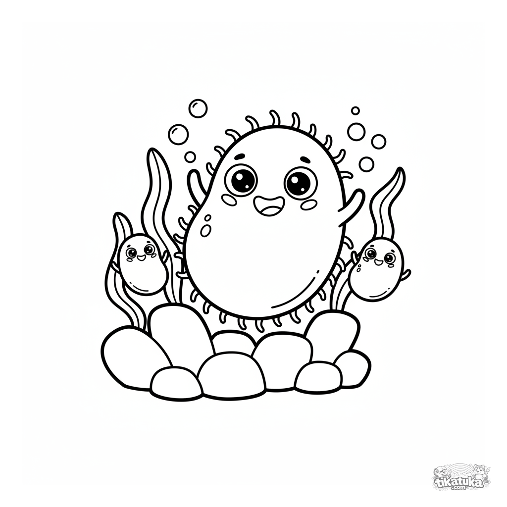 Simple coloring page of a cute cartoon bacterium swimming near a coral reef. For toddlers aged 2-3, with large, simple shapes and minimal detail.