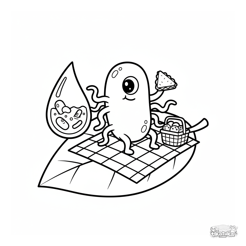 Fun coloring page of a bacterium for toddlers (2-5 years). The friendly bacterium has a picnic on a big leaf with a blanket and basket.