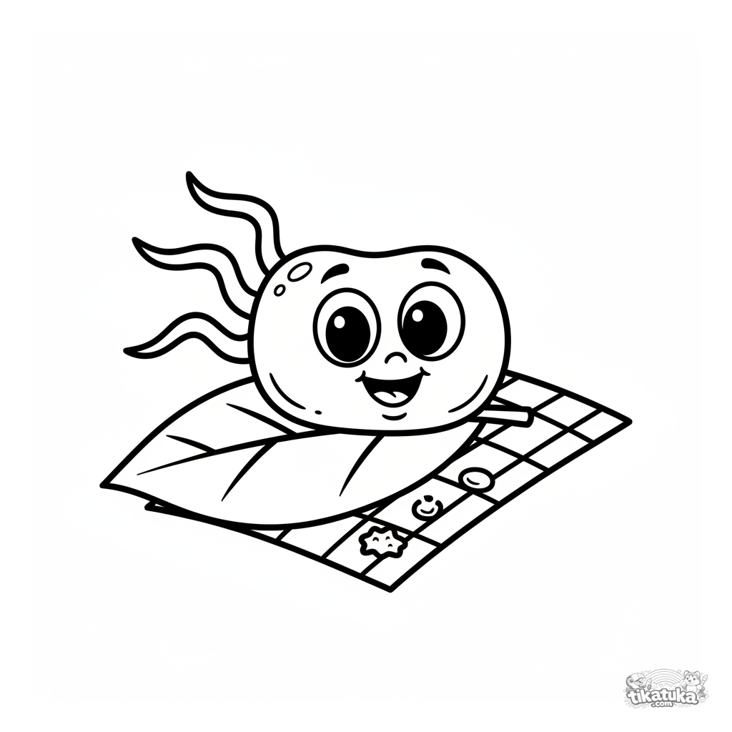 Fun coloring page of a cartoon bacterium having a picnic on a leaf. For toddlers 2-5. Simple scene with a checkered blanket, water droplet, and crumb.