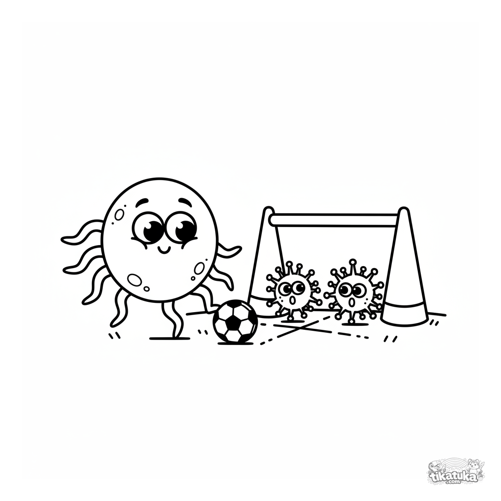 Simple coloring page for toddlers: a happy bacterium with flagella plays soccer with cartoon viruses. For kids aged 2-5. Large, simple shapes.
