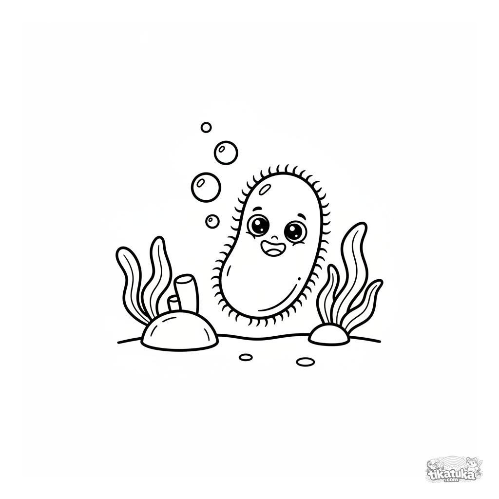 Toddler coloring page 2-3: a cute cartoon bacterium with big googly eyes swims happily near a coral reef. Very simple, large shapes.