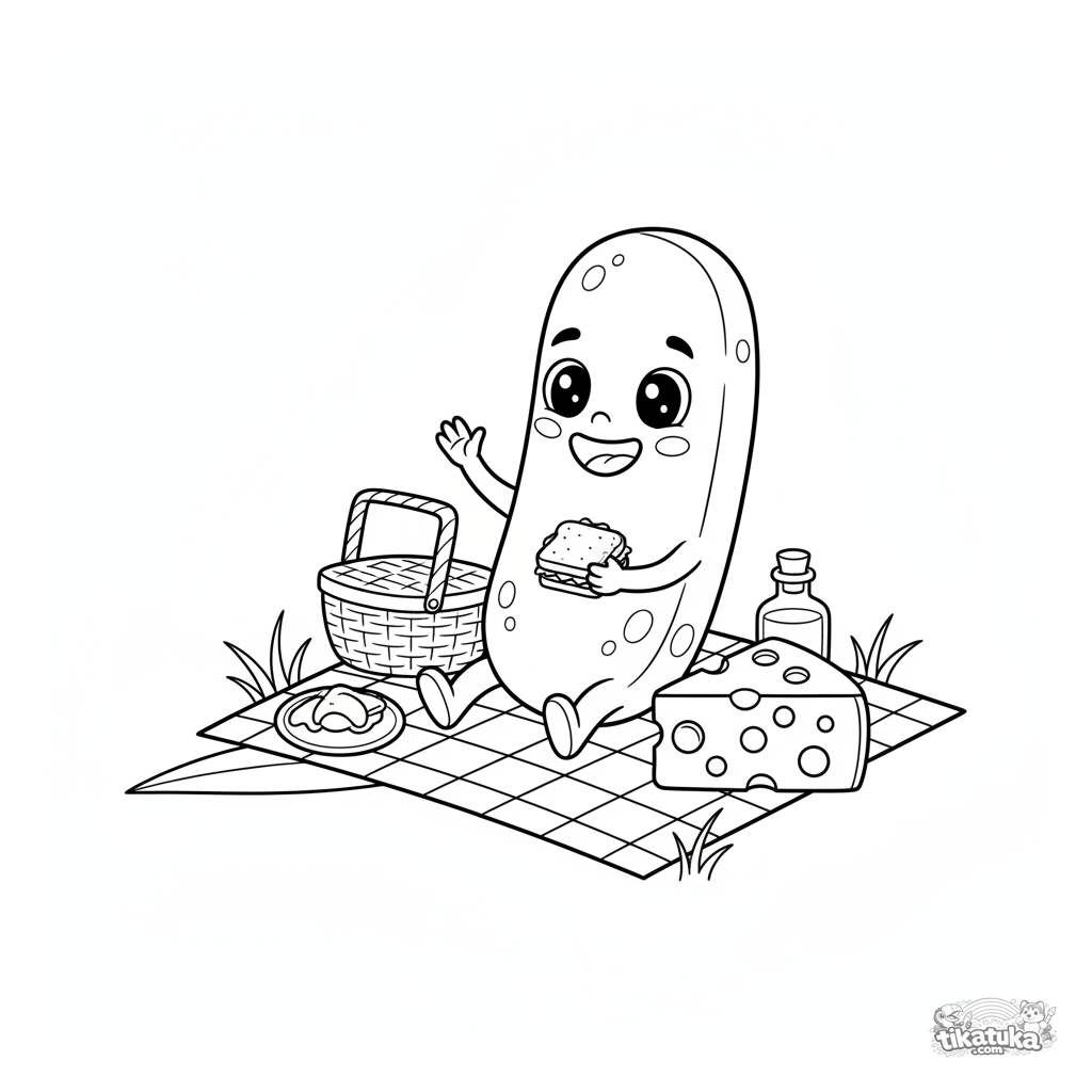 Fun coloring page for kids 5-8: a friendly Lactobacillus bacterium having a picnic on a blade of grass. Cartoon style, educational theme.