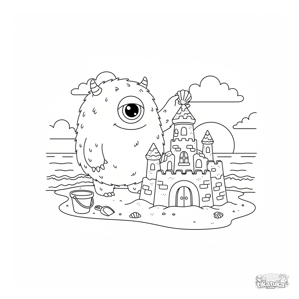 Coloring page for kids 4-6: a cute furry monster with one eye builds a sandcastle on a beach at sunset. Scene with bucket and seashell.