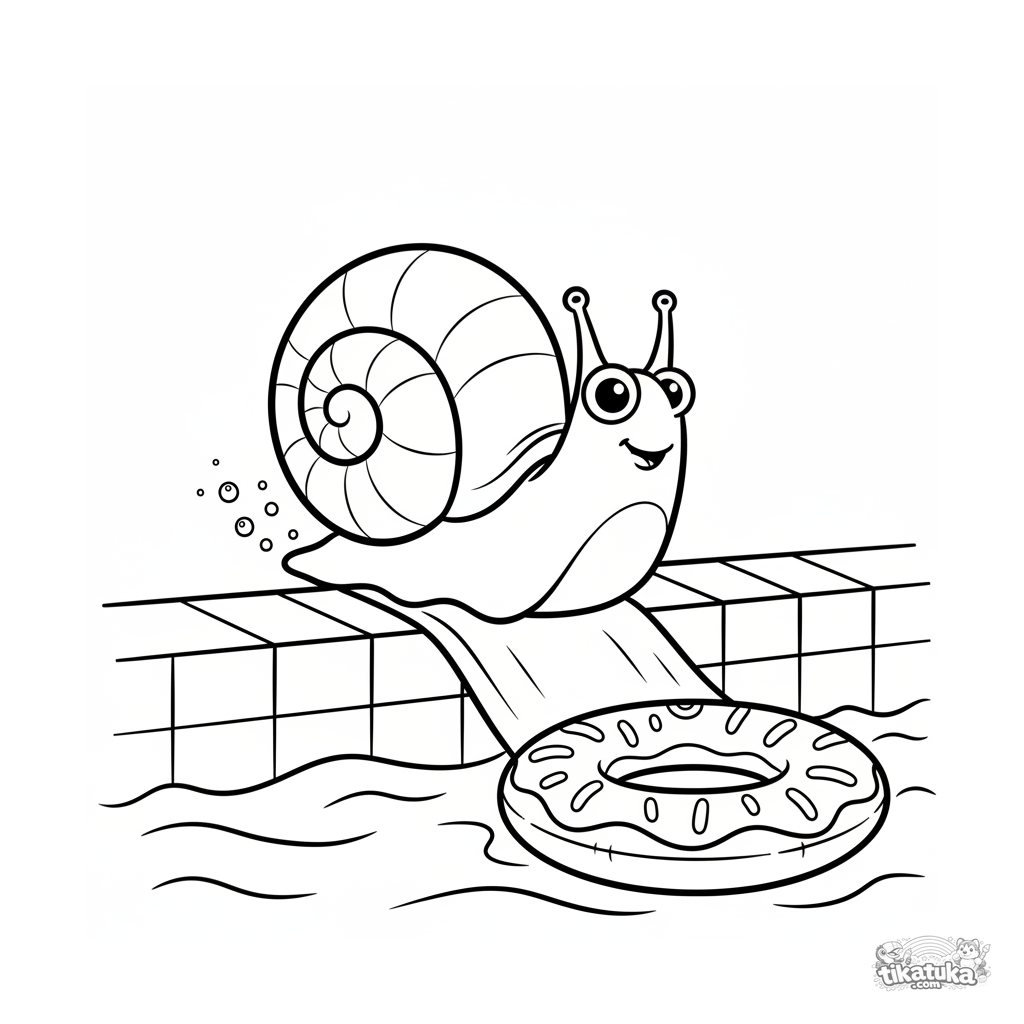Coloring page for kids 4-6: a happy snail in a shell slides down the pool wall towards an inflatable ring at the bottom. Playful scene, clear outlines, cute face.