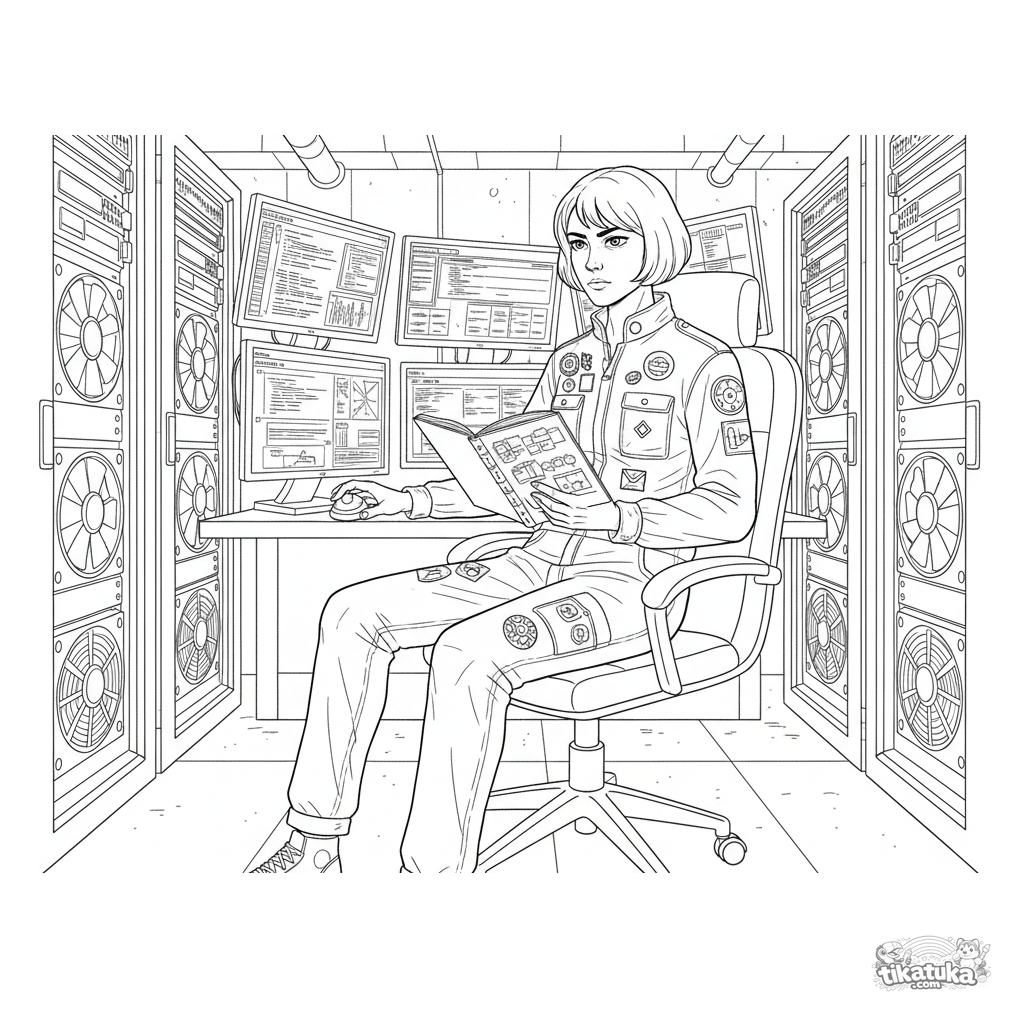 Coloring page for ages 10-12: a cyber security enthusiast working in a basement server farm. Detailed server racks, multiple monitors, cooling fans, and diagrams.