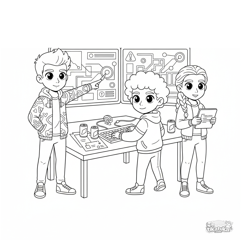 Coloring page for kids 10-12: a cybersecurity team monitoring threats on a wall of screens in a basement. Details: whiteboard diagrams, tablets, energy drinks. Comic-adventure style.